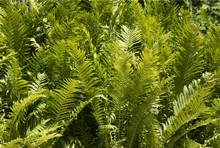 Sie trotzen Wind und Wetter im Winter und erinnern während dieser Zeit an einen Geigenwedel. Manche Farnarten sind sogar wintergrün. Sie begrünen in diesem Fall den Garten auch in der dunklen Jahreszeit, in der außer der Winterheide wenig wächst. Ihre Fortpflanzung sichern Farne durch die sogenannten Sporangien. Der Begriff steht für Sporenbehälter an der Unterseite ihrer Blätter. Farne haben als Blattschmuckpflanzen kaum Ansprüche an die Bodenbeschaffenheit. Sie gedeihen prächtig, wenn sie nicht zu sonnig gepflanzt werden, zum Beispiel im Schatten großer Bäume. Auch Ecken im Garten, die blickdicht gestaltet werden sollen, können durch hochwachsende Farnarten geschlossen werden. Unter den vielen Farnarten finden sich einige prächtige Blattschmuckpflanzen, die durch durchgängige, imposante Blätter oder Rippen imponieren. Generell passt der Farn in jeden Garten!