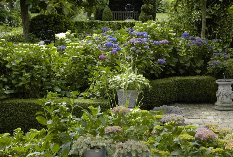 Gartengestaltung mit Pflanzgefäßen in verschiedenen Gärten