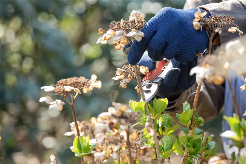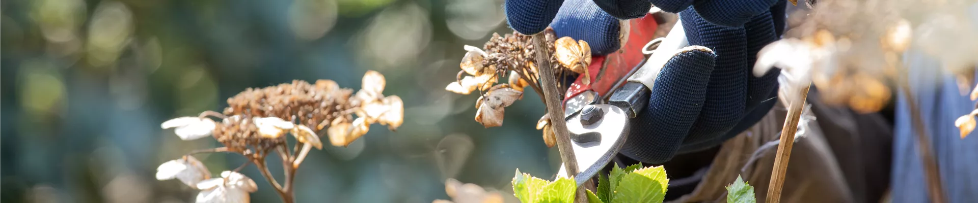 Zum Frühjahrsputz im Garten gehört auch der Rückschnitt einiger Pflanzen. Einige Stauden und Sträucher oder Gräser brauchen diesen Rückschnitt, damit sie im neuen Gartenjahr in voller Pracht zurückkommen und in neuem Glanz erstrahlen können. Bambus ist da ein gutes Beispiel, denn die Stiele und Halme sterben im Herbst und Winter ab und bevor dann im neuen Jahr die neuen Triebe zum Vorschein kommen, sollte man die alten entfernen, um Platz zu schaffen. Auch bei Stauden ist das der Fall, wenn oberirdische Pflanzenteile abgestorben sind und sich die Pflanze in die Wurzeln oder Rhizome zurückgezogen hat. Der Rückschnitt regt bei einigen Pflanzen auch das Ausbilden frischer neuer Triebe an, daher sollte man den Rückschnitt nicht zu früh ansetzen, damit die jungen Triebe nicht bei nächtlichen Frösten erfrieren. Wann genau welche Pflanze ihren Rückschnitt braucht, der zum Frühjahrsputz im Garten gehört, hängt ganz von Pflanzenart und -sorte ab. Es gibt also keine Faustregel, wann man mit der Schere durch den Garten gehen sollte. Hortensien z.B. unterscheiden sich je nach Sorte auch innerhalb der Pflanzengruppe und während Rispenhortensien einen Rückschnitt im Herbst brauchen, werden die alten Blütenstände der Bauernhortensien erst im Frühjahr abgeschnitten.