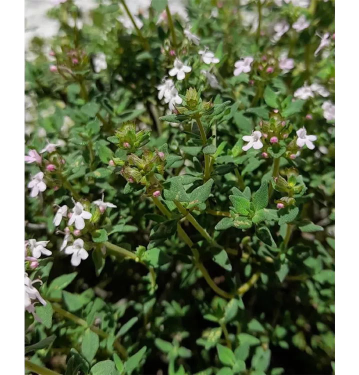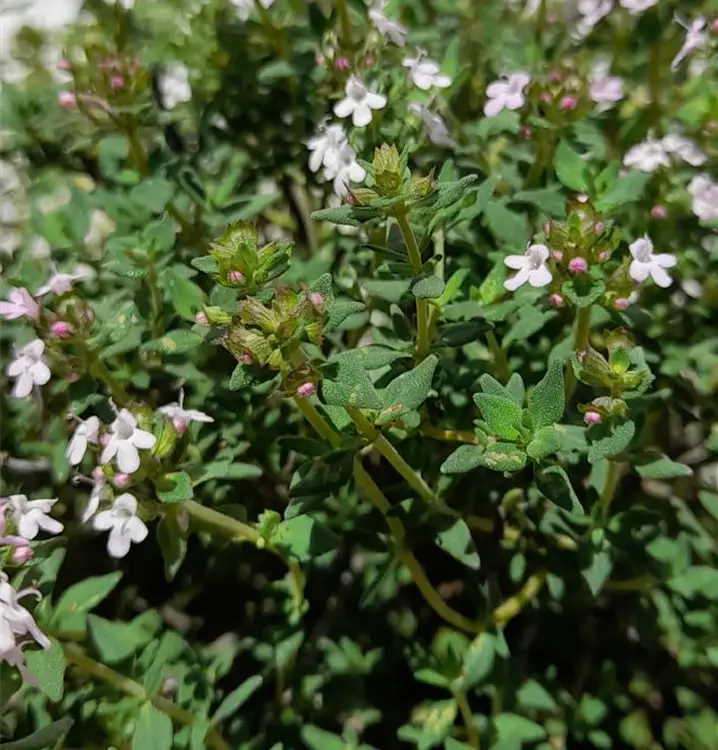 Kompakter Thymian mit kleinen graugrünen Blättern, angenehemes Zitronen- und Rosenduft-Aroma.