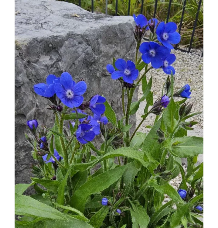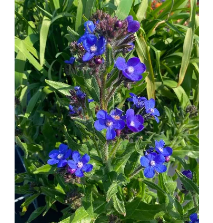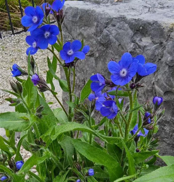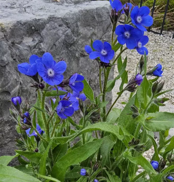 Blüte: leuchtend enzianblau, radförmig in lockeren Rispen, VI-VII,