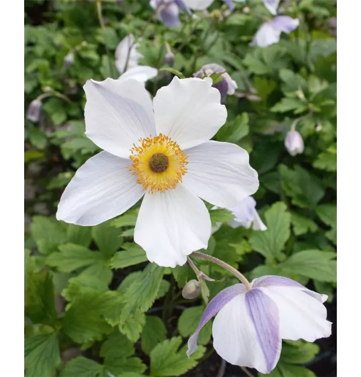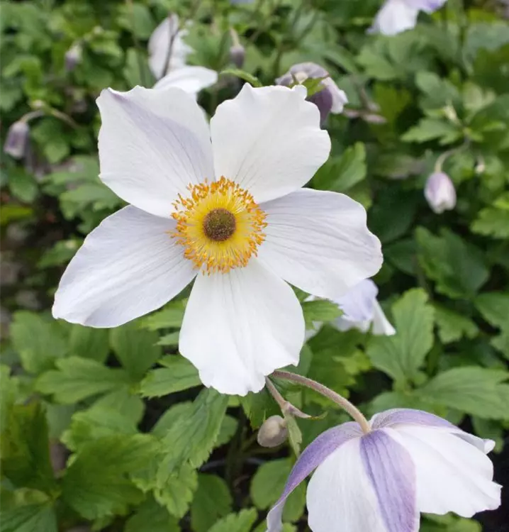 Blüte: weiß, einfach, Blütenrückseite violett, VI-X
