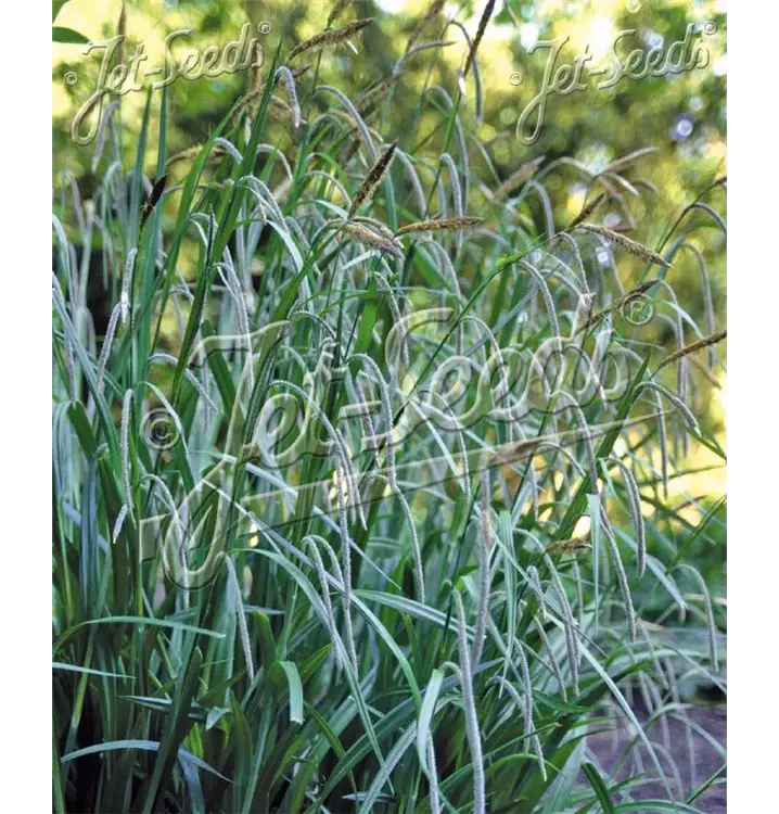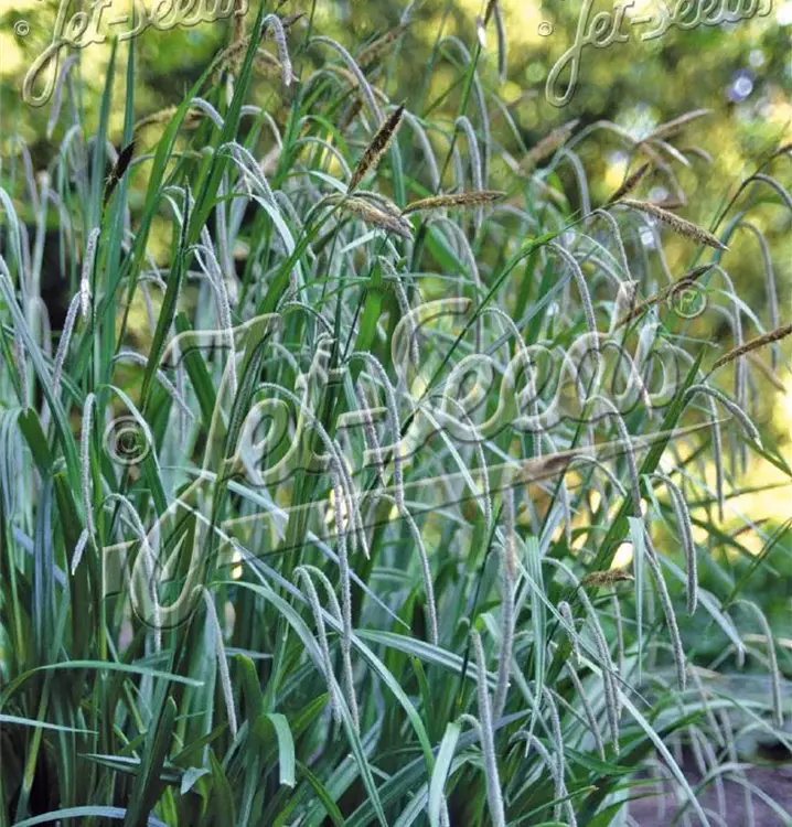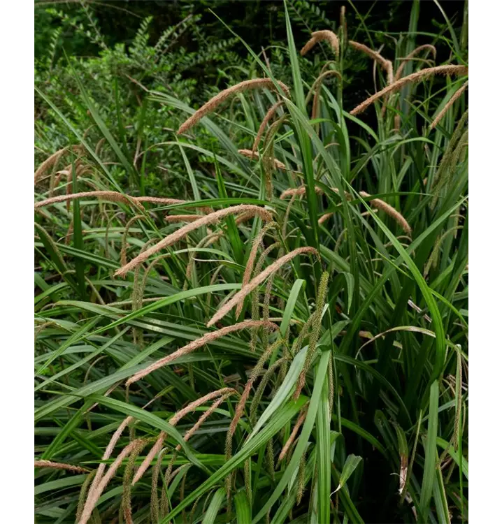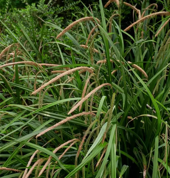 Blüte: hohe, überhängende Ähren mit langen, grünlich-braunen Blüten, VI-VII