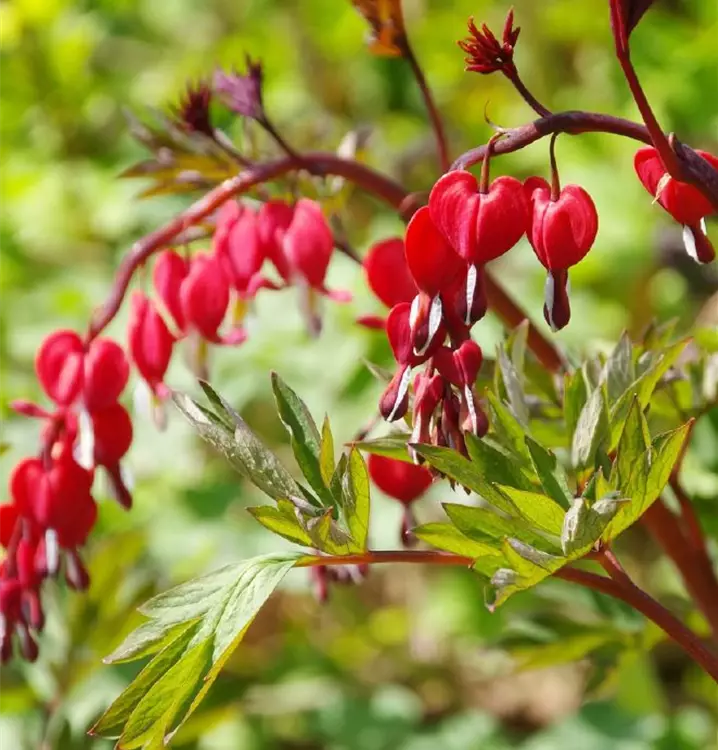 Blüte: rot, herzförmig, grünes Laub.