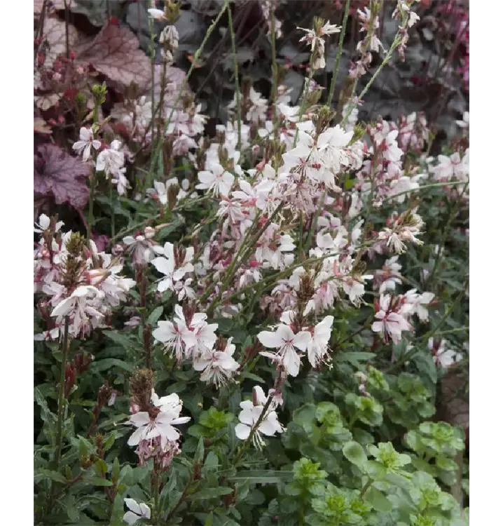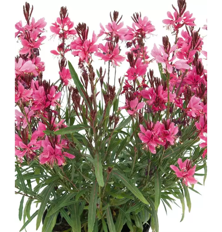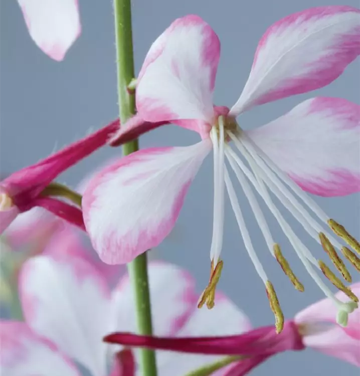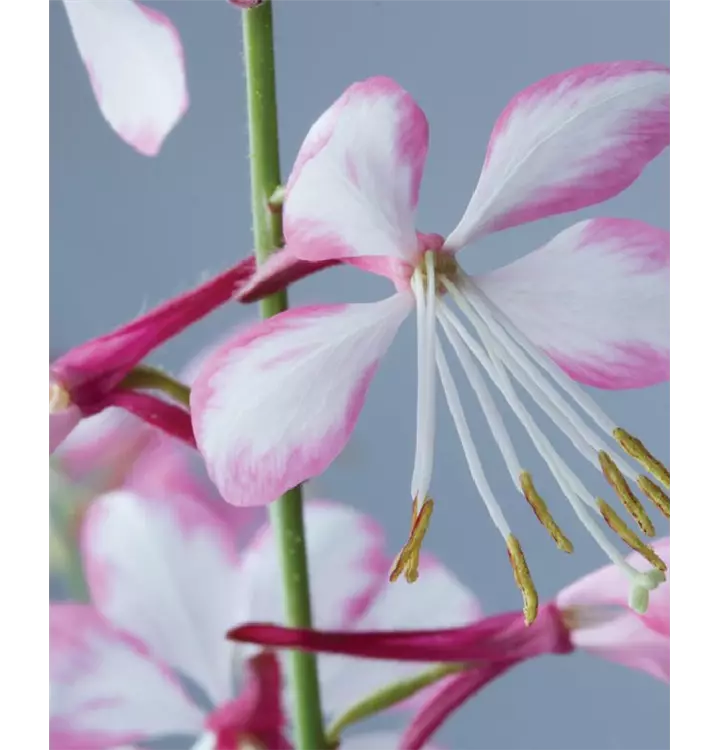 Blüte: weiß mit pinkfarbenem Rand, VI-X, Dauerblüher.