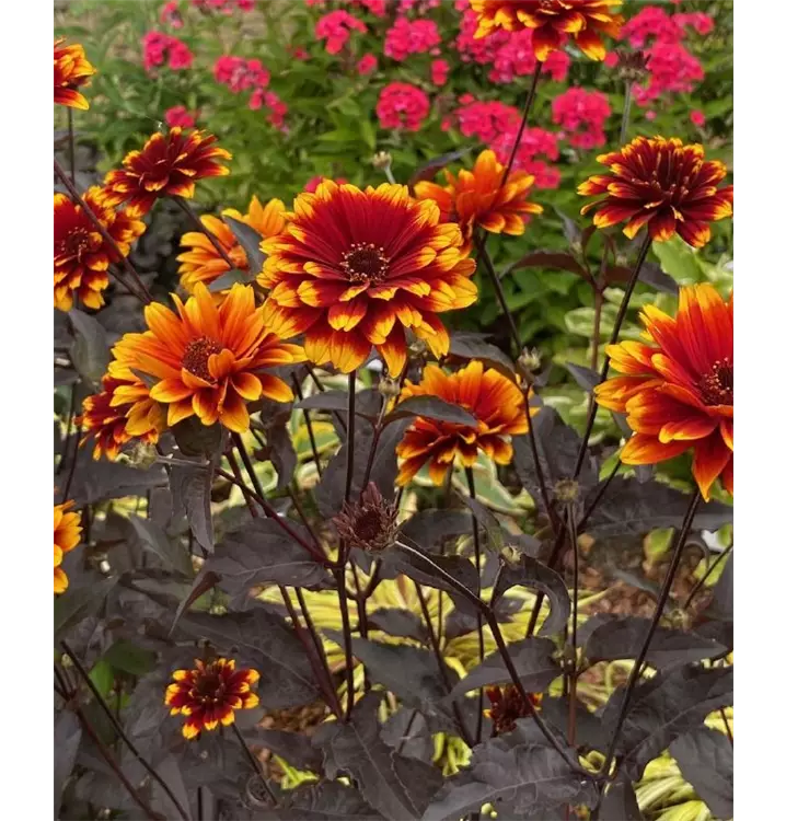 Blüte: leuchtend gelb mit rotem Auge, einfach, VII-X, dunkelgrünes Laub.