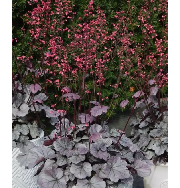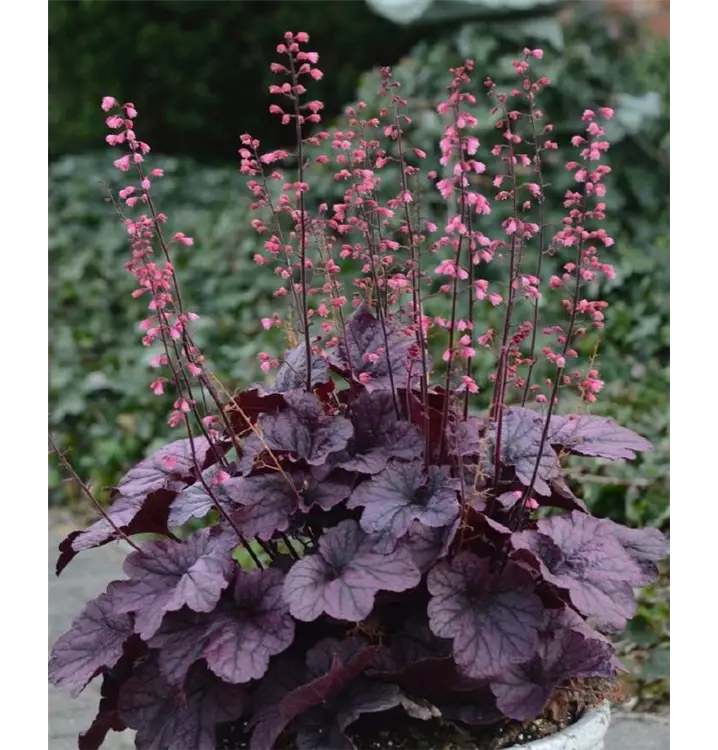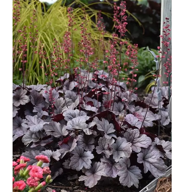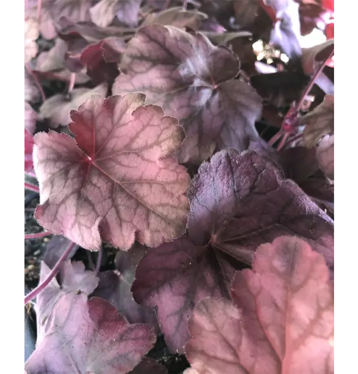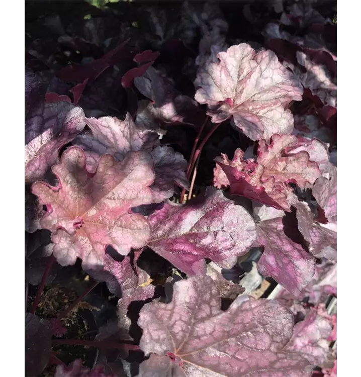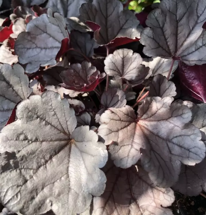 Silber-graues Laub mit dunkler Aderung, lila bis purpurne Blattunterseite.
