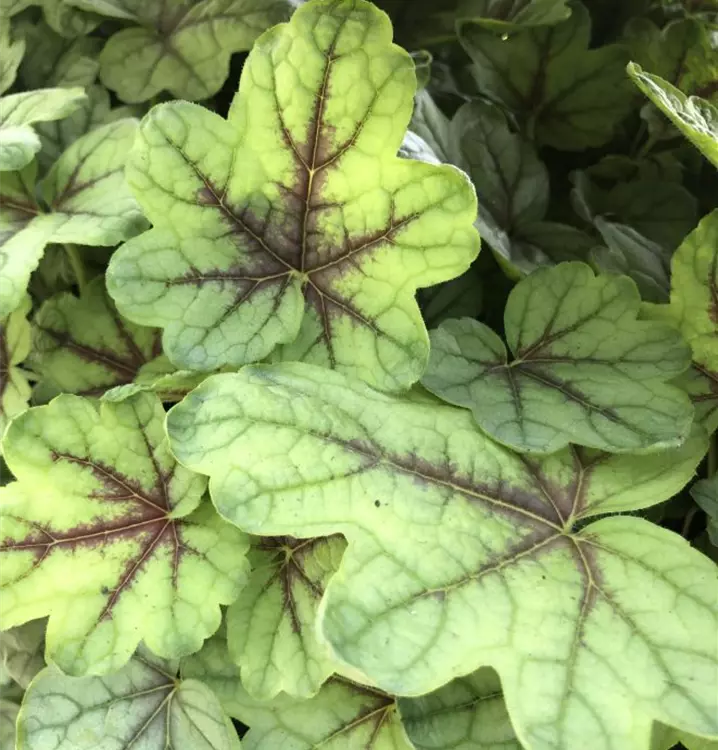 Laub grün mit weinroten bis purpurnen Adern, silbrig überzogen.