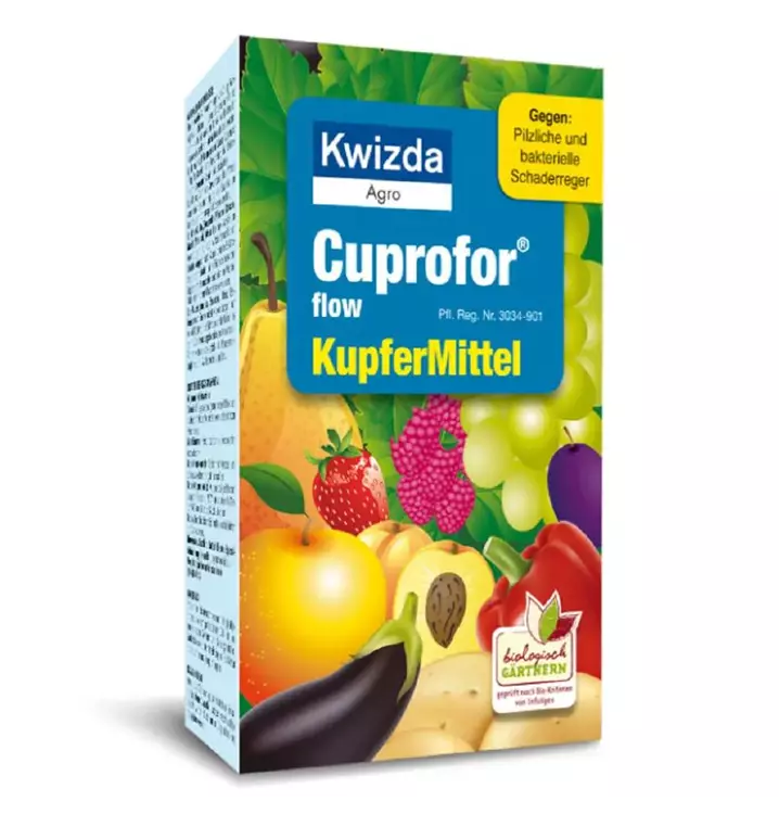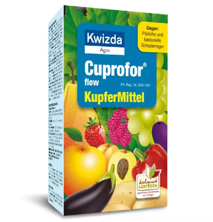 KupferMittel Cuprofor flow ist ein regenbeständiges Haftkupfer auf Basis Kupferoxychlorid mit hervorragender Haftfähigkeit und hat sichere pilztötende Wirkung sowie ausgezeichnete Schwebefähigkeit durch feinste Teilchengröße und ist daher auch für Sprühgeräte bestens geeignet.