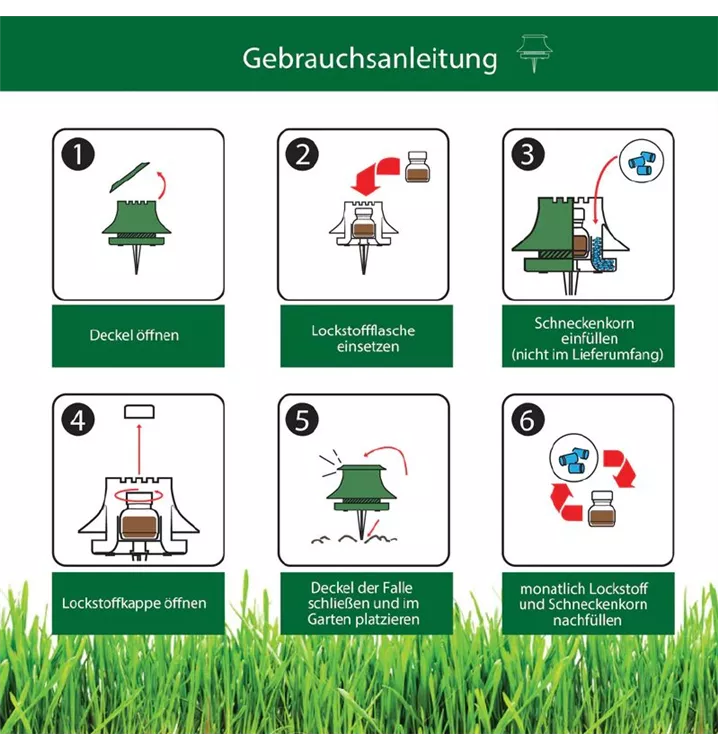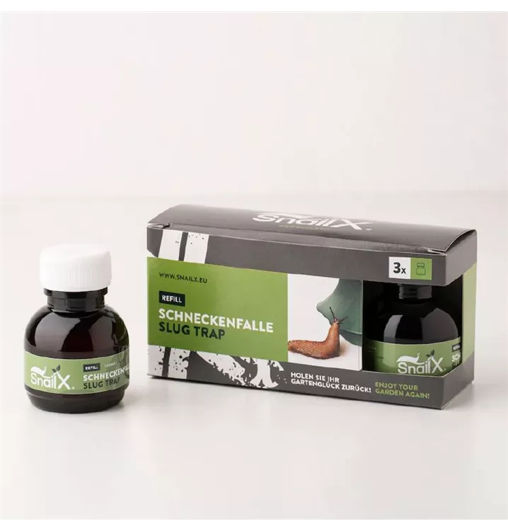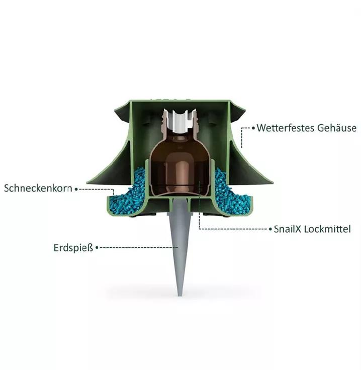 Die wetterfeste Schneckenfalle von SnailX bekämpft Schnecken im gesamten Garten einfach, schnell und effektiv. Das patentierte Funktionsprinzip der Schneckenfalle vereint ein hocheffizientes Lockmittel mit Schneckenkorn (Eisen-III-Phosphat). Einfach monatlich das Lockmittelfläschchen (Nachfüllpackung) tauschen und Schneckenkorn nachfüllen. Die Schnecken werden - auch aus großer Entfernung - angelockt, verspeisen das Schneckenkorn, verkriechen sich wieder in ihr Versteck und verbleiben dort. Somit entsteht kein Kontakt zu verendeten Schnecken. Lass dein Gemüse und deine Blumen wieder kräftig und ohne Schneckenfraß wachsen und gedeihen - und sichere dir mit SnailX dein Gartenglück!