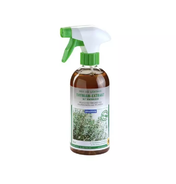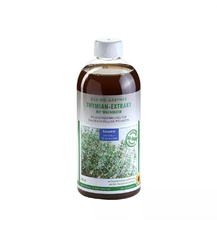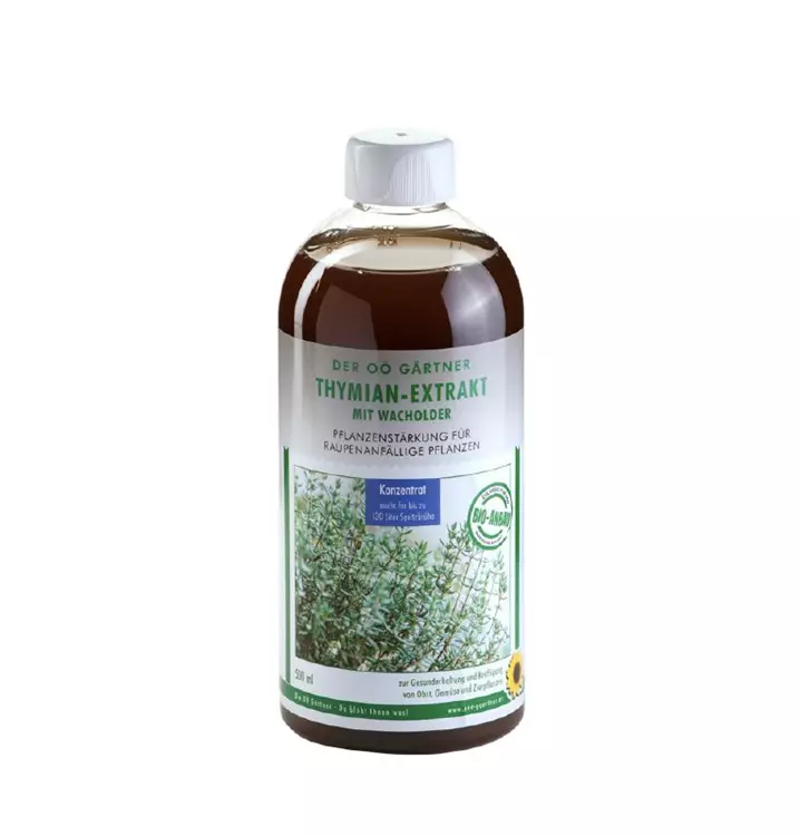 Der OÖ Gärtner Thymian-Extrakt stärkt die Pflanzen mit der Kraft der Natur und fördert gesundes Wachstum von Anfang an. Die wertvollen Inhaltsstoffe von Thymian und Wacholder stärken raupenanfällige Zier- und Balkonpflanzen, Obst und Gemüse.