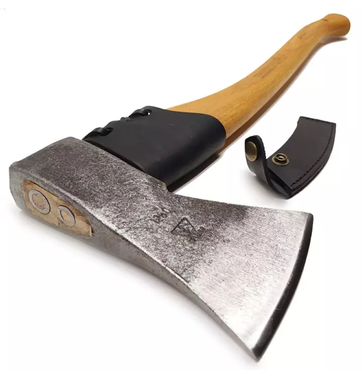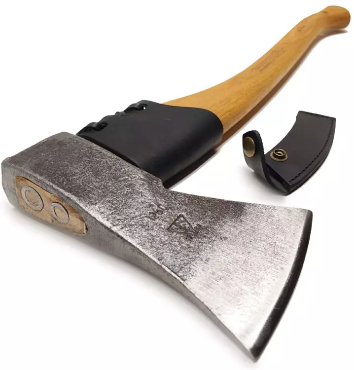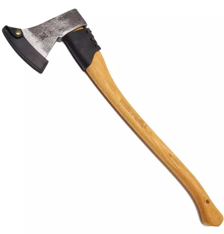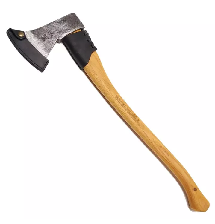 Geschmiedete Forstaxt Nr. 0366 von Krumpholz mit gefirnissten 70 cm Hickorystiel und handgenähtem Lederschutz mit einem Kopfgewicht von 1250 Gramm. Zum Baumfällen und Entasten.