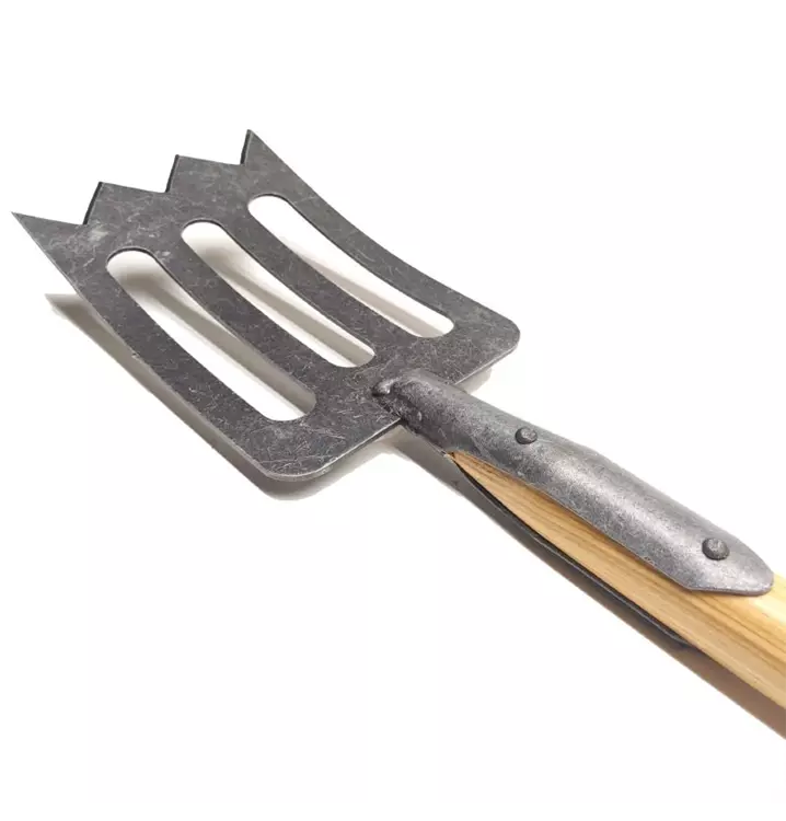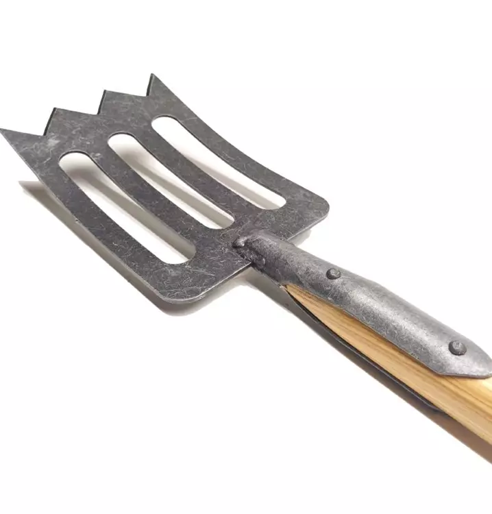 Das wesentliche Merkmal von einem Spork ist die zickzack-förmige Schneide. Das Blatt ist handgeschmiedet aus hochwertigem Boronstahl. Boronstahl ist ein sehr harter aber trotzdem flexibler Stahl, der auch bei Hochleistungsbauteilen im Automobilbau zum Einsatz kommt. Die handgeschmiedeten, messerscharfen Spitzen sind äußerst robust und ermöglichen ein einzigartiges, müheloses Eindringen in harte Böden oder durch feste Wurzeln und schärfen sich dabei von selbst nach. Durch die Aussparungen im Blatt dringt der SPORK mühelos in den Boden ein. Die Löcher im Werkzeug unterstützen das funktionelle Prinzip und reduzieren gleichzeitig das Gewicht.