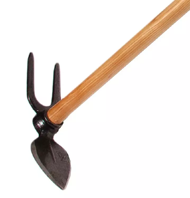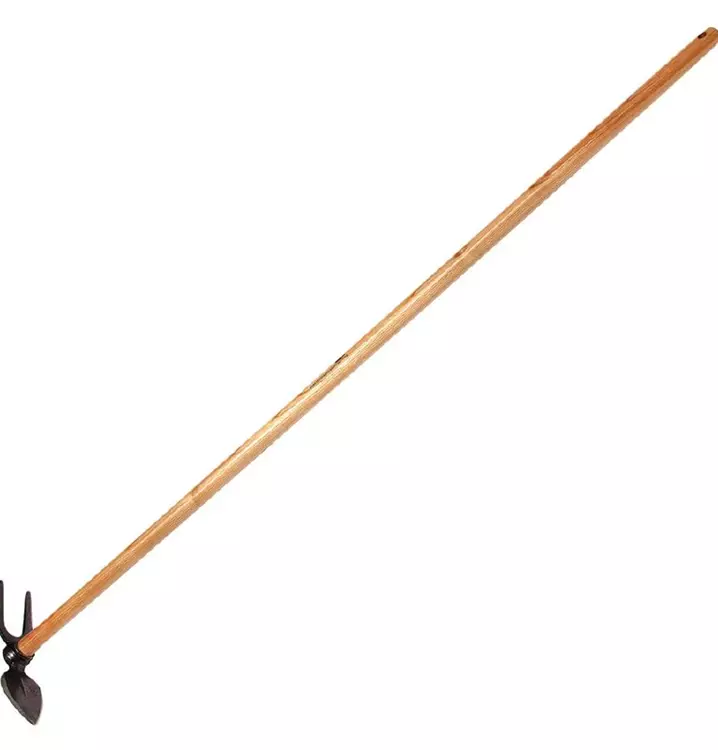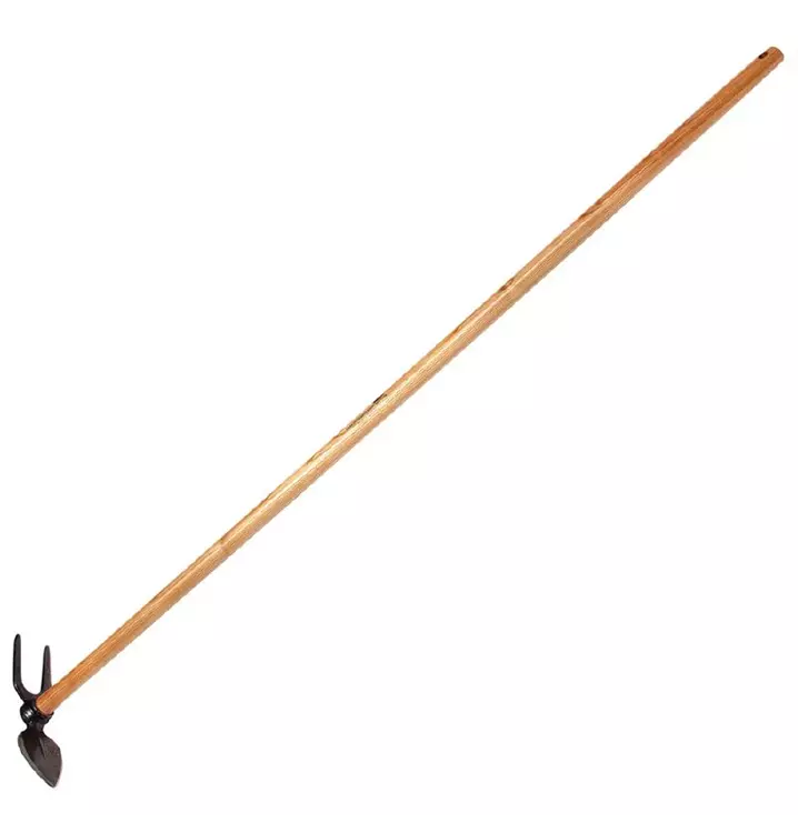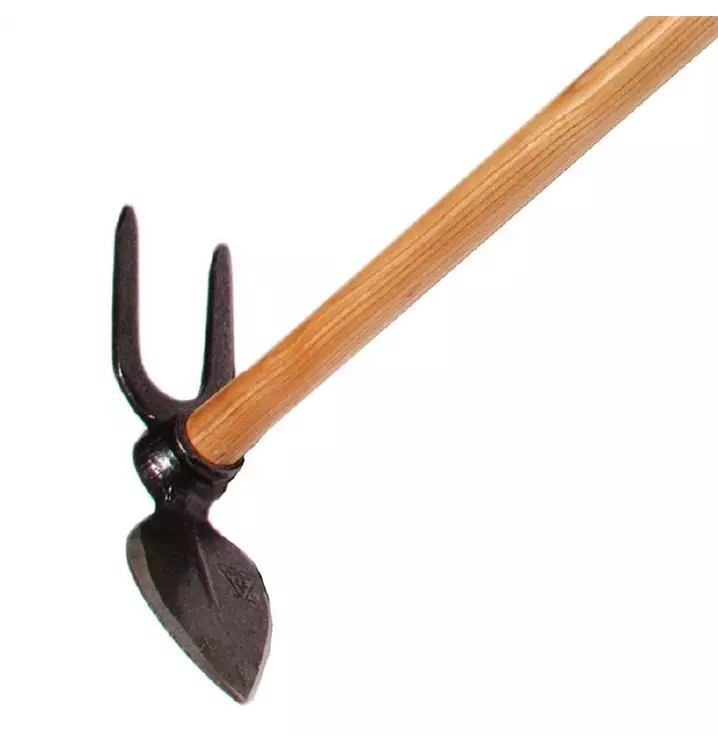 Geschmiedetes Gartenwerkzeug Gartenhacke in Herzblattform mit zwei Zinken und 130 cm langem, lackiertem Stiel aus Eschenholz.