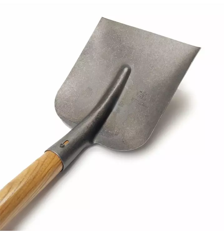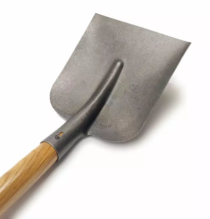 Spatenblatt aus Kohlenstoffstahl geschmiedet, gehärtet und klar lackiert.