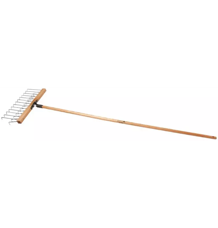 Da der Laubrechen sehr sperrig für den Versand ist, liefern wir ihn zerlegt in zwei Teile. Kopf und Stiel werden getrennt. Das minimiert zudem die Gefahr eines Transportschadens. Die Montage ist in einer Minute erledigt. Auch hierzu wird ausschließlich ein Schraubenschlüssel der Größe 10 benötigt.