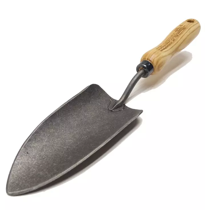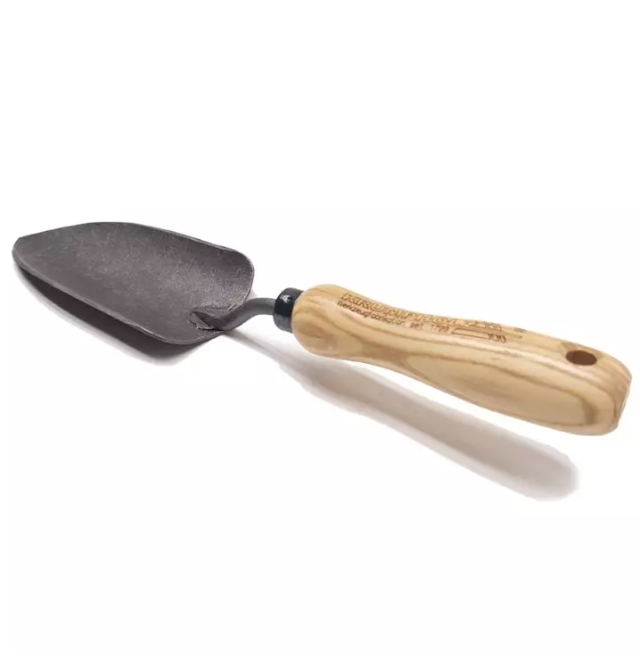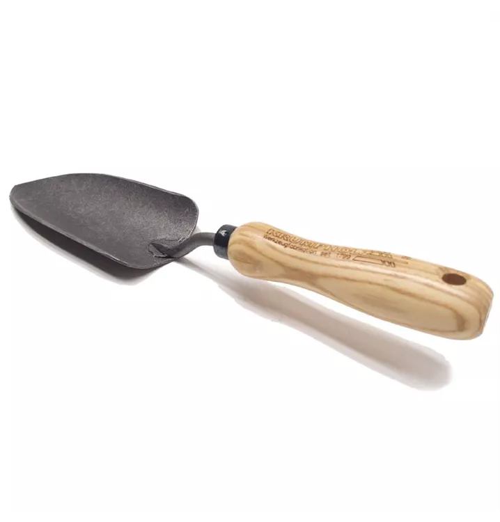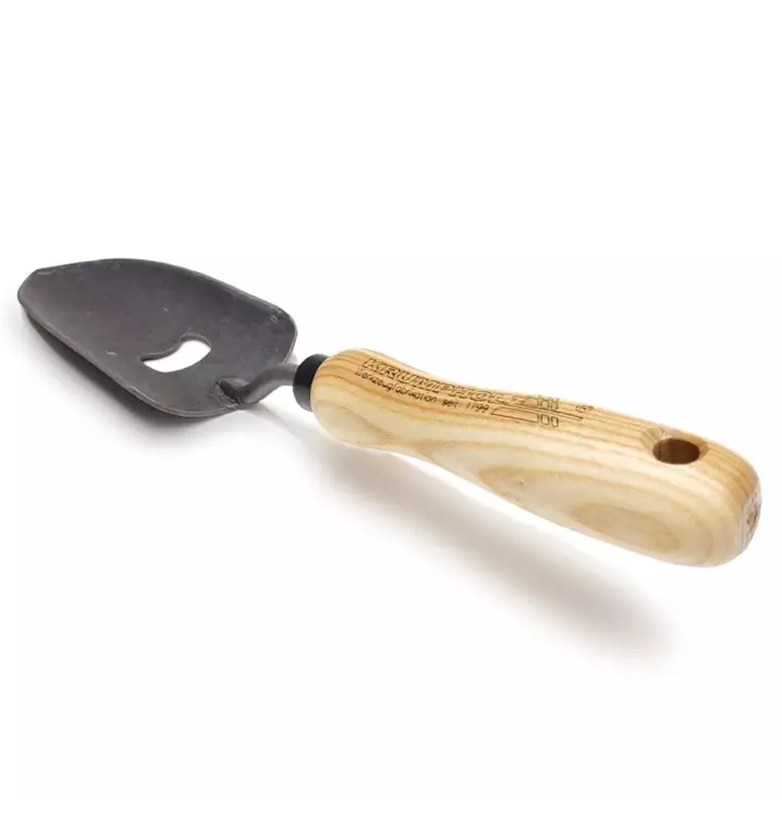 Geschmiedete, schmale Pflanzkelle Nr. 1310 von Krumpholz mit 14 cm Eschengriff. Für das Setzen von Pflanzen in Steingärten und steinigen Untergründen.